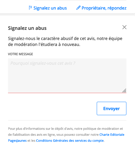 Si un acteur de l’immobilier considère qu’un avis a échappé à l’œil vigilant des Pages Jaunes et ne respecte pas sa charge éditoriale, il peut cliquer sur le lien « Signalez un abus » qui se trouver sous l’avis. Ce clic entraînera un réexamen de l’avis pour s’assurer qu’il respecte bien la charte. Dans le cas contraire, les personnels du site Pages Jaunes seront amenés à le retirer. Le réexamen peut demander plusieurs jours pendant lesquels l’avis restera présent sur les Pages Jaunes.