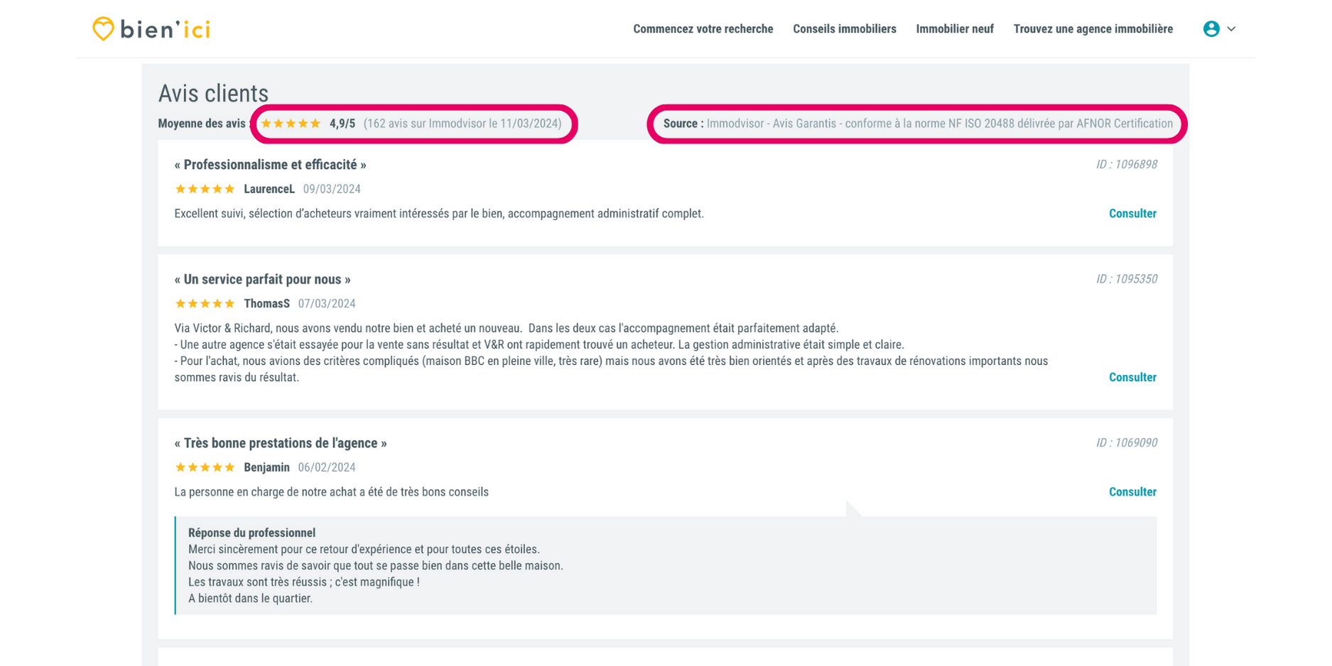 Les avis clients jouent un rôle crucial lorsqu’il faut choisir un professionnel pour son projet immobilier. En effet, les avis sont des éléments de transparence mettant en avant le professionnalisme et la fiabilité des acteurs de l’immobilier. En apparaissant sur Bien’ici, les avis clients des professionnels de l’immobilier représentés sur la plateforme peuvent être consultés par les internautes et vont renforcer la confiance. C’est un véritable élément de réassurance !
